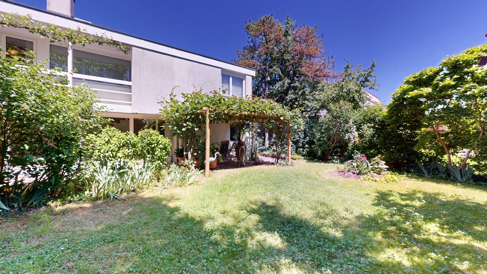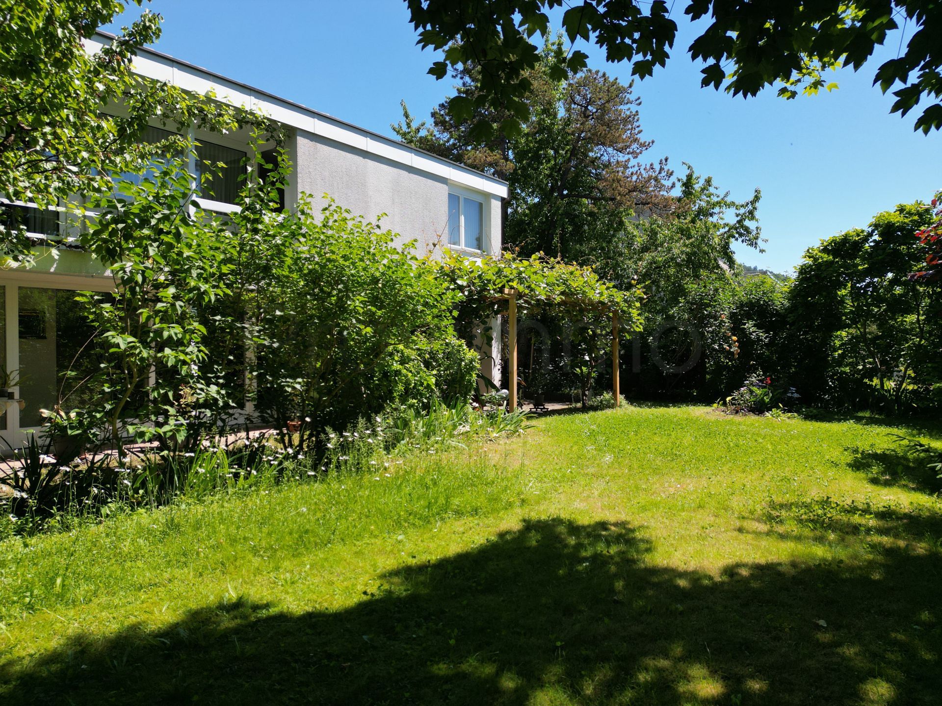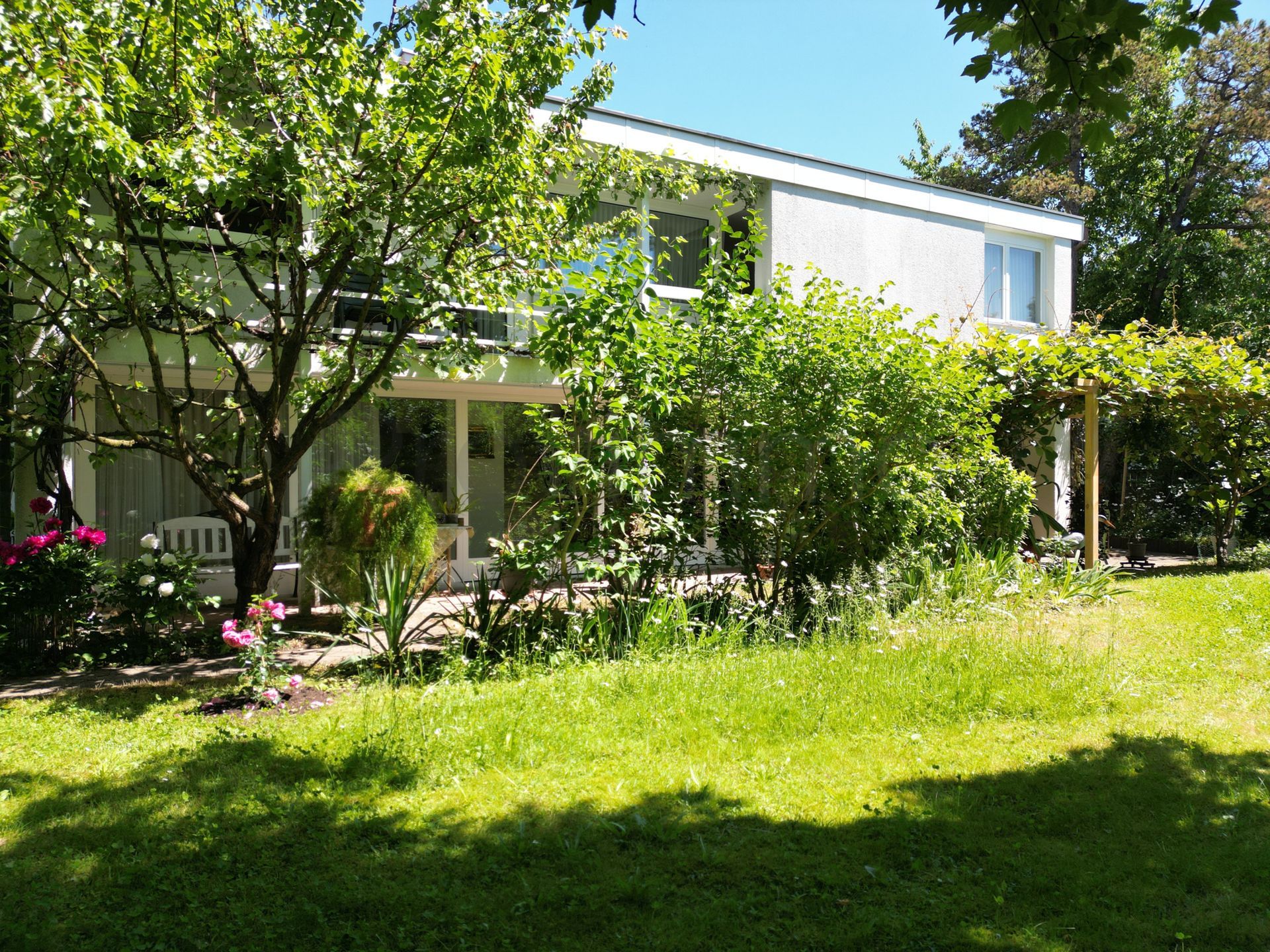 Der gepflegte Garten ist eine Oase der Ruhe: Eine grosszügige Rasenfläche, ein gedeckter Sitzplatz mit Pergola, ein weiterer Frühstücksplatz auf der Ostseite sowie ein praktisches Gartenhaus bieten vielseitige Nutzungsmöglichkeiten. Umgeben von natürlichem Baumbestand geniessen Sie hier absolute Privatsphäre und entspannte Stunden im Grünen – bei jeder Witterung und zu jeder Jahreszeit.
