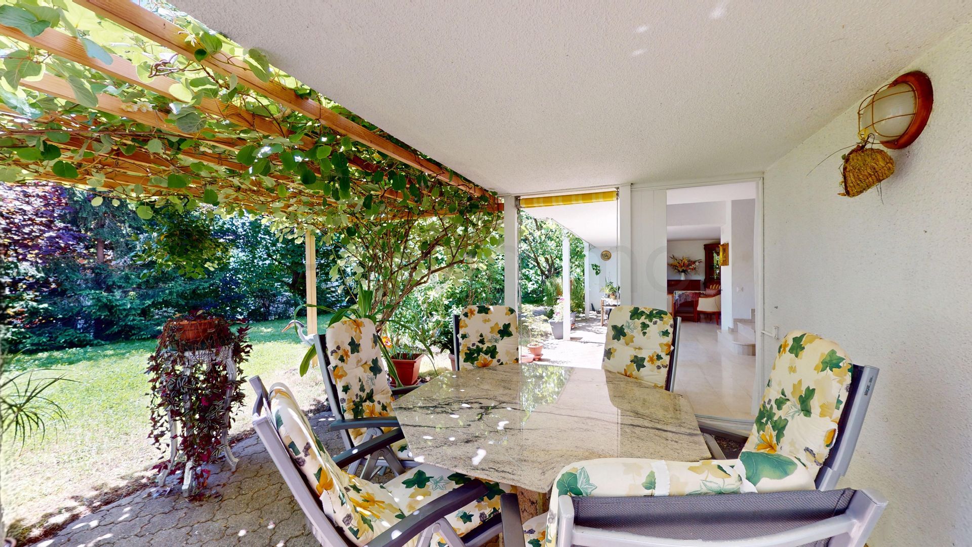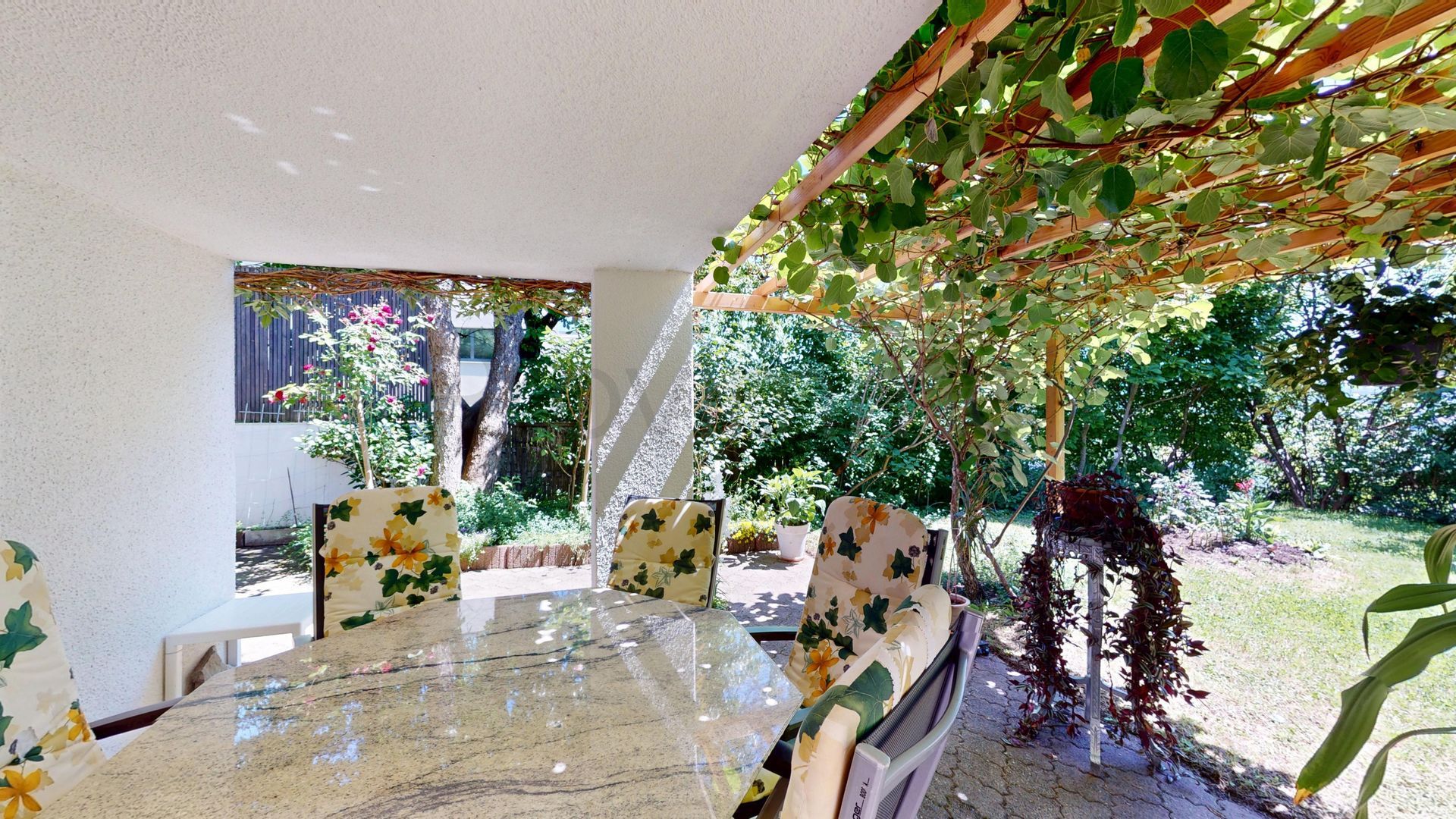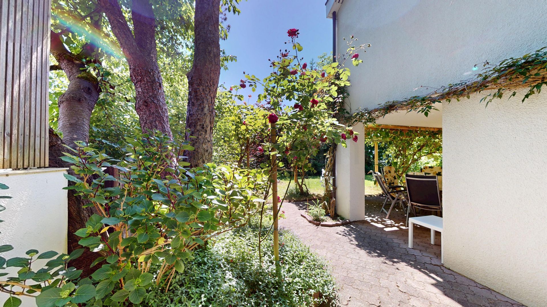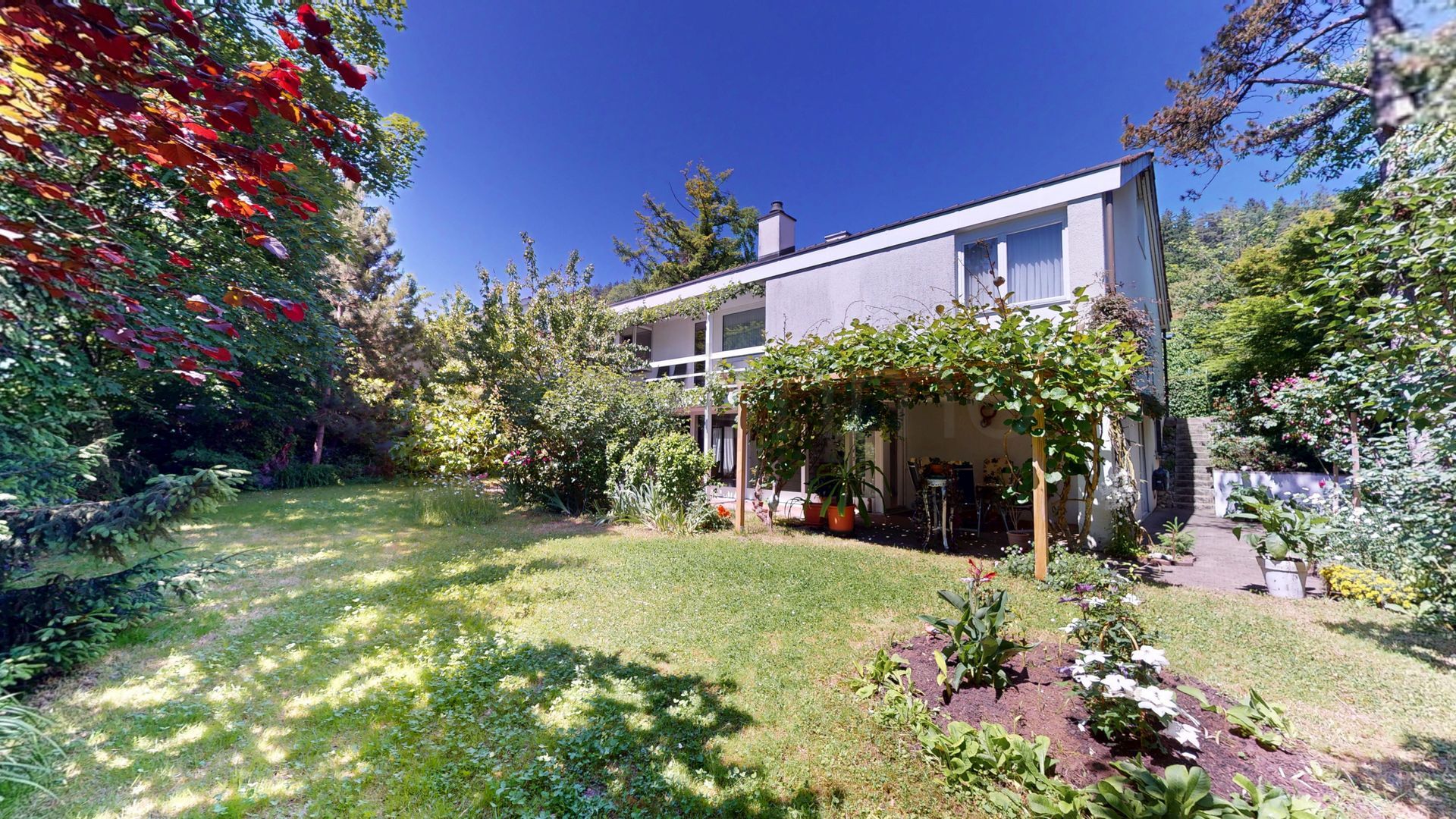 Der gepflegte Garten ist eine Oase der Ruhe: Eine grosszügige Rasenfläche, ein gedeckter Sitzplatz mit Pergola, ein weiterer Frühstücksplatz auf der Ostseite sowie ein praktisches Gartenhaus bieten vielseitige Nutzungsmöglichkeiten. Umgeben von natürlichem Baumbestand geniessen Sie hier absolute Privatsphäre und entspannte Stunden im Grünen – bei jeder Witterung und zu jeder Jahreszeit.
