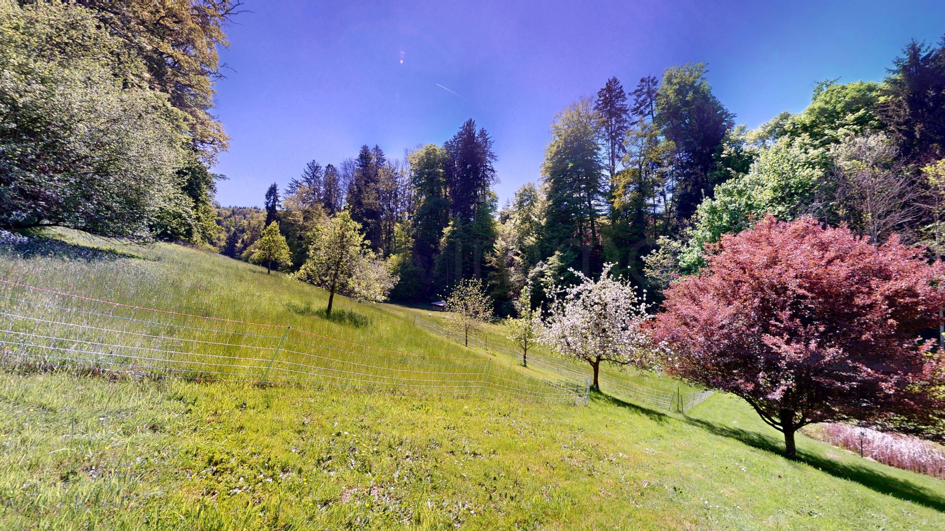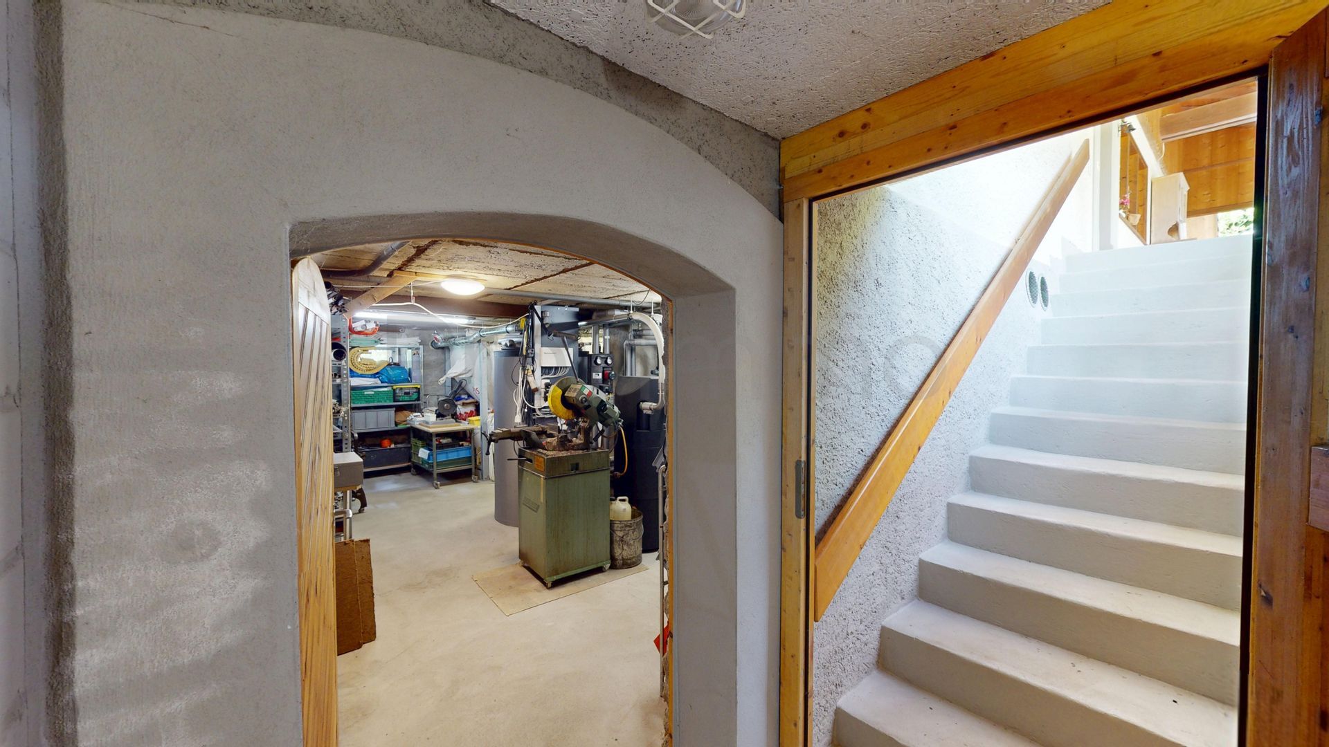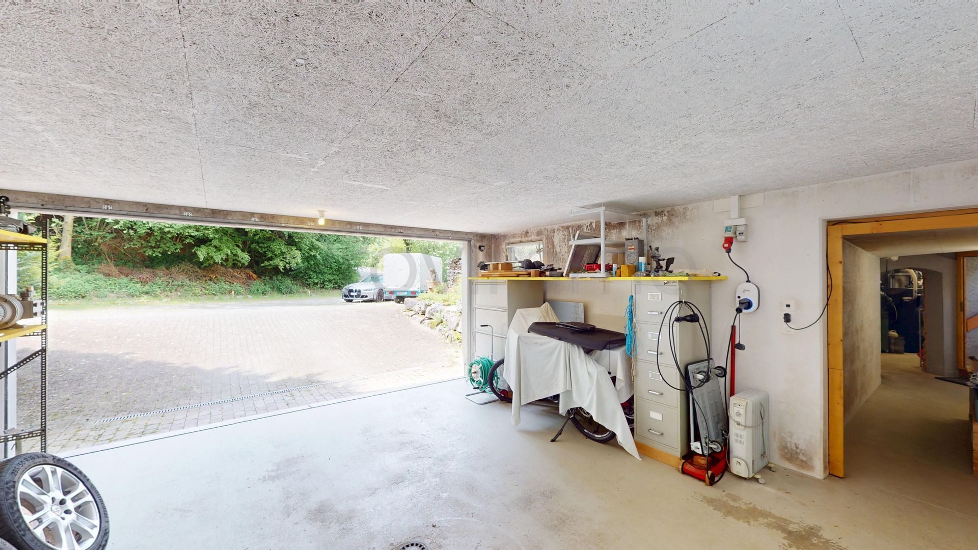 Ein grosser Vorteil dieser Liegenschaft sind die vielfältigen Neben- und Nutzflächen. Die Doppelgarage mit elektrischem Garagentor ist Teil eines separaten Nebengebäudes und durch einen unterirdischen Verbindungstunnel direkt mit dem Wohnhaus verbunden – praktisch, um bei Regen trocken mit den Einkäufen nach Hause zu gelangen. Oberhalb der Garage mit Ladestation für Elektroautos befindet sich eine geräumige Werkstatt, die sich ideal als Atelier, Hobbyraum oder – besonders interessant für Tierhalter – auch als Stallung für Kleintiere oder Pferde umbauen lässt. Wer Tiere liebt, findet hier ideale Bedingungen vor: viel Grün, genügend Platz und die Ruhe, die Tiere zum Wohlfühlen brauchen.