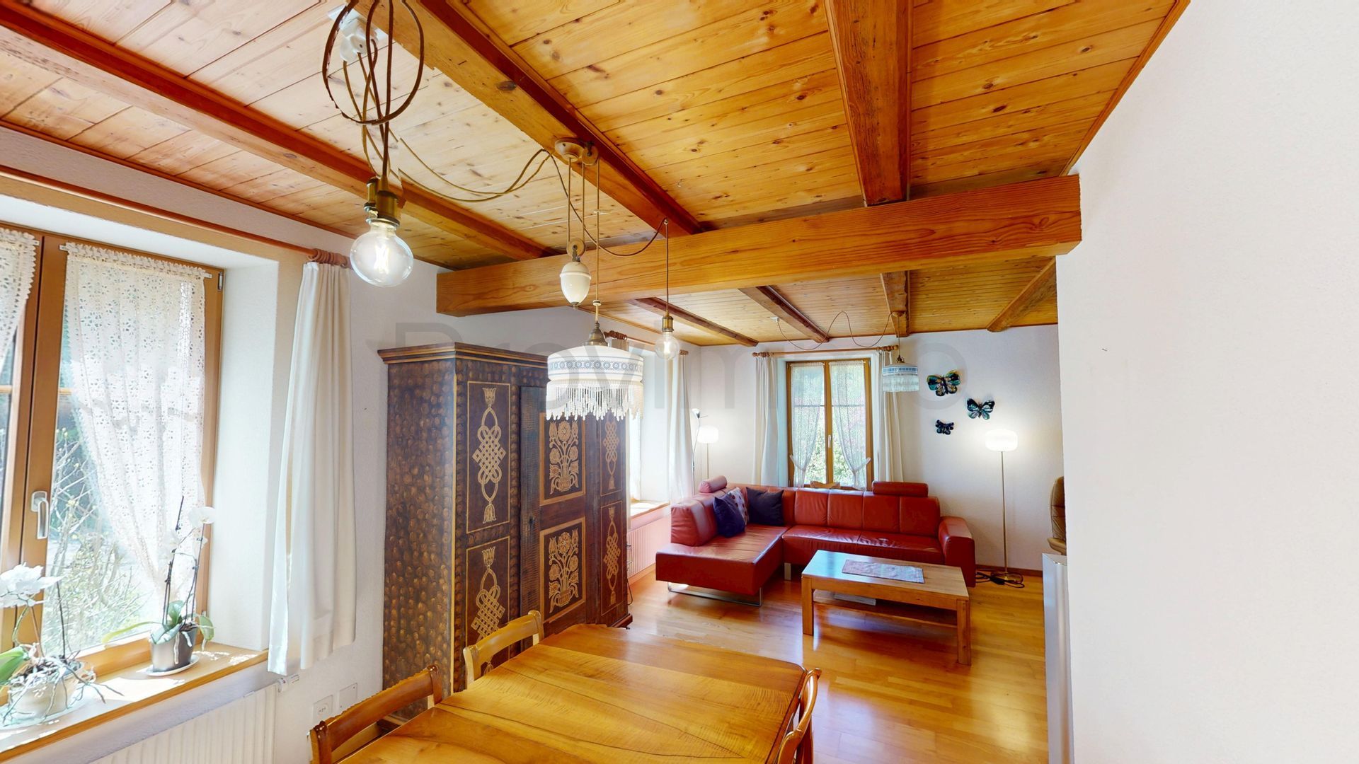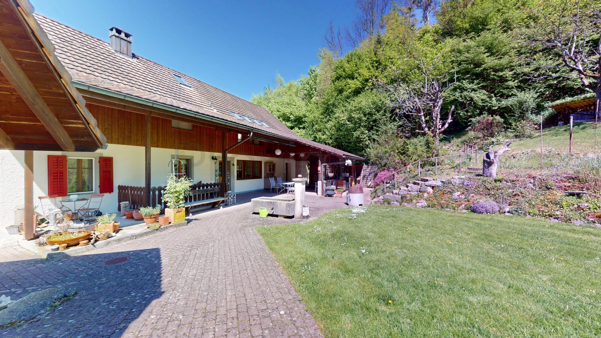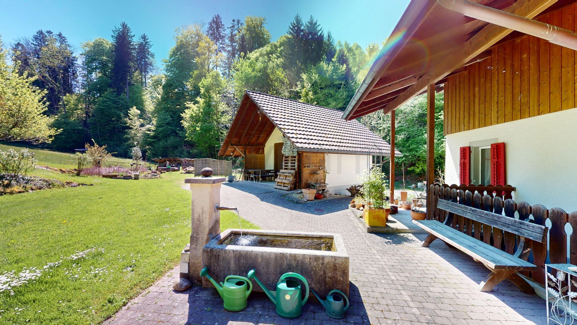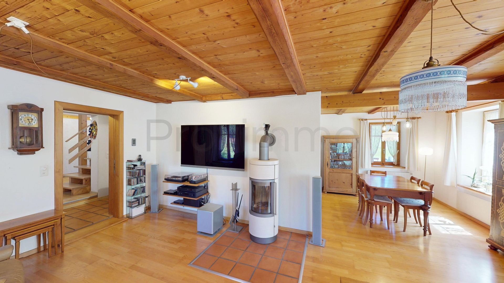Ein grosser Vorteil dieser Liegenschaft sind die vielfältigen Neben- und Nutzflächen. Die Doppelgarage mit elektrischem Garagentor ist Teil eines separaten Nebengebäudes und durch einen unterirdischen Verbindungstunnel direkt mit dem Wohnhaus verbunden – praktisch, um bei Regen trocken mit den Einkäufen nach Hause zu gelangen. Oberhalb der Garage mit Ladestation für Elektroautos befindet sich eine geräumige Werkstatt, die sich ideal als Atelier, Hobbyraum oder – besonders interessant für Tierhalter – auch als Stallung für Kleintiere oder Pferde umbauen lässt. Wer Tiere liebt, findet hier ideale Bedingungen vor: viel Grün, genügend Platz und die Ruhe, die Tiere zum Wohlfühlen brauchen.