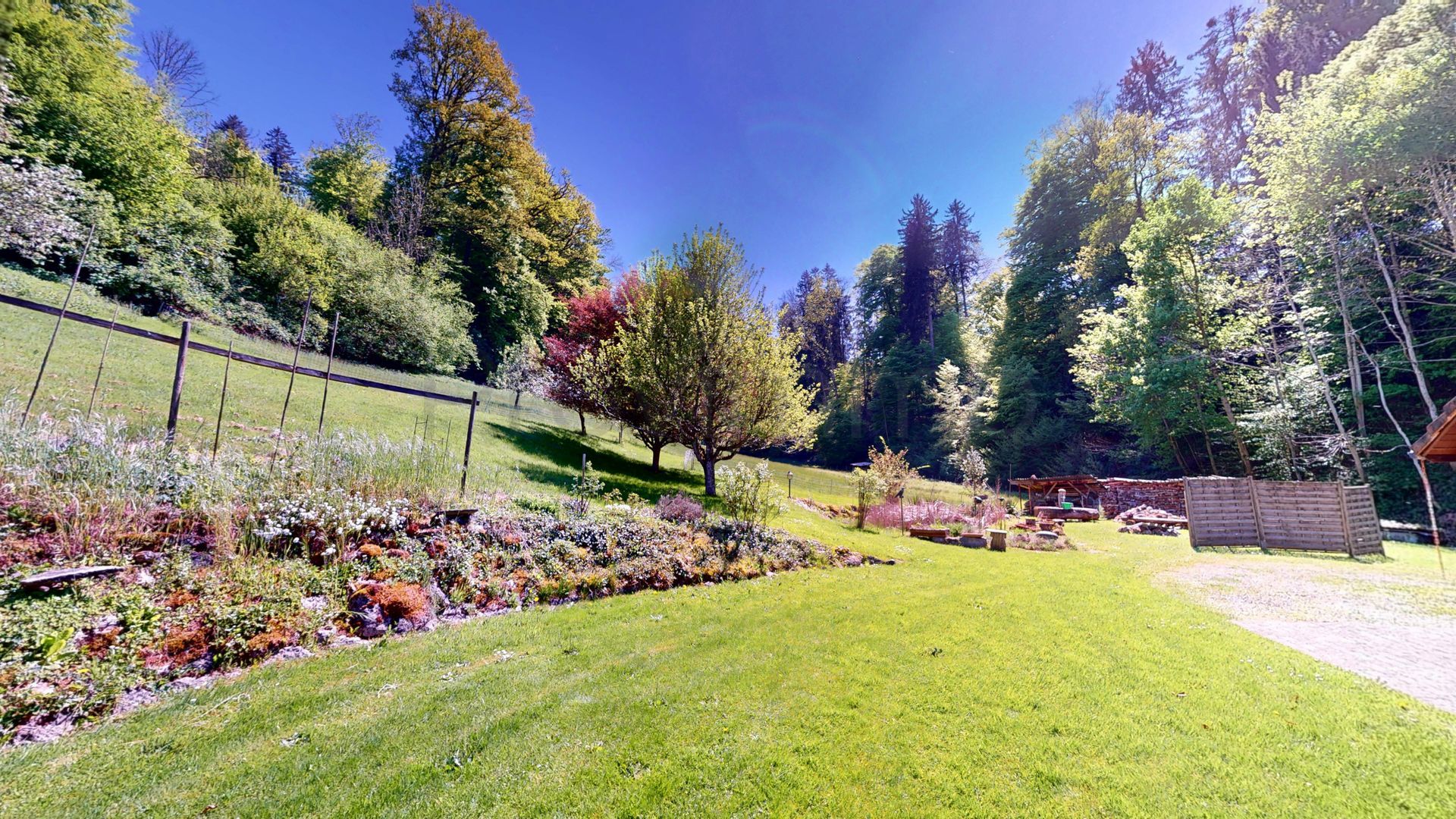 Die Umgebung des Hauses ist ein kleines Paradies für Naturliebhaber: Mehrere liebevoll angelegte Sitzplätze laden zum Verweilen ein, geschützte Rückzugsorte bieten Ruhe und Erholung. Ein idyllischer Naturteich unterstreicht den besonderen Charakter dieser Liegenschaft – hier finden Mensch und Tier ein Zuhause, das ihresgleichen sucht.