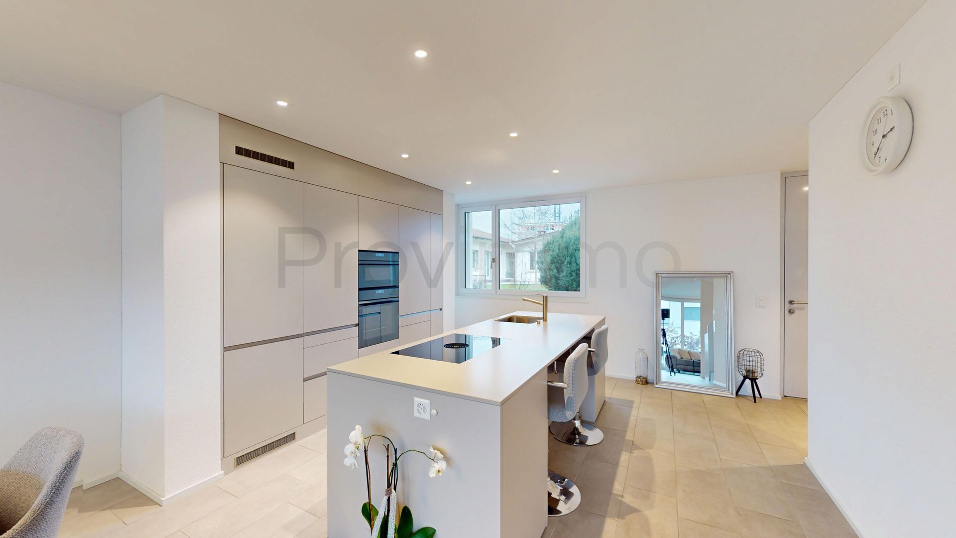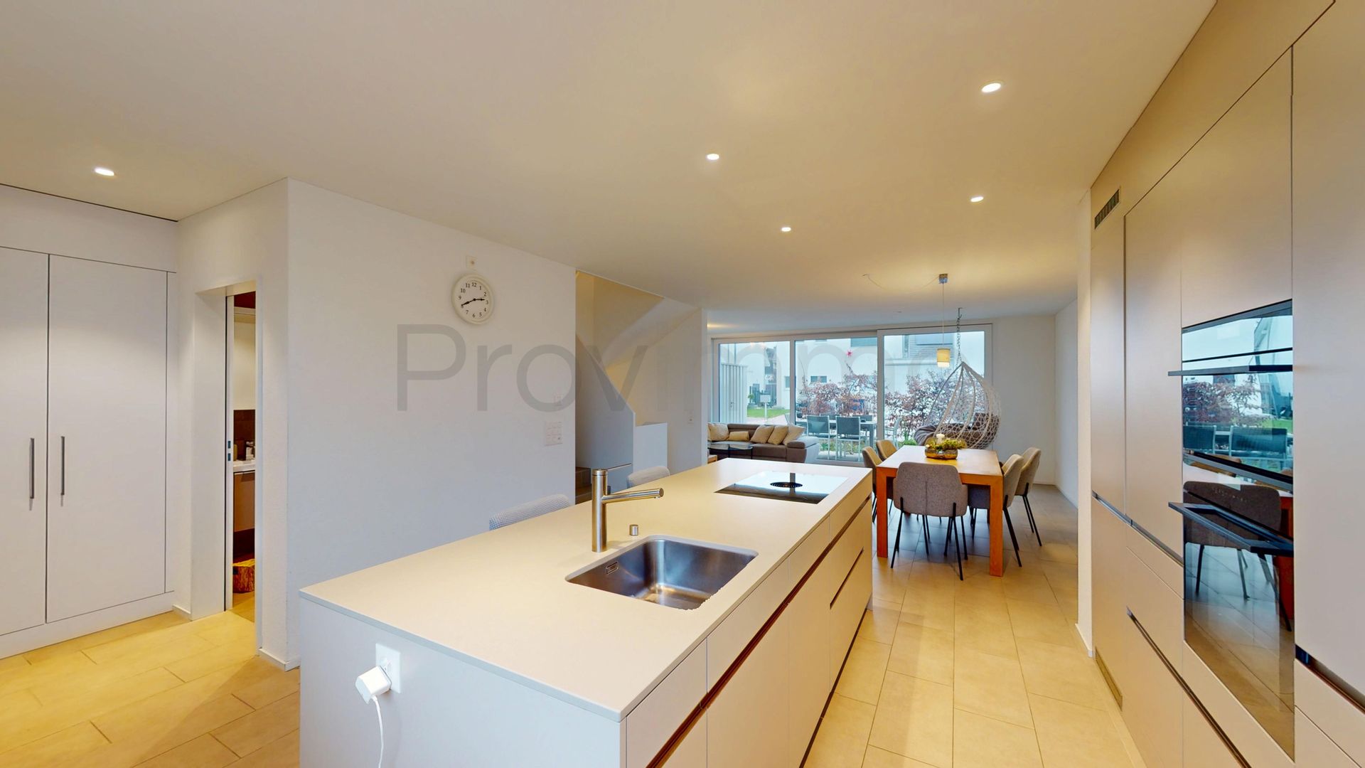 Bereits beim Betreten des Hauses fällt die architektonische Qualität ins Auge. Grosszügige, weit ausladende Vordächer beim Hauseingang sowie beim Gartensitzplatz verleihen dem Objekt einen einladenden und selbstbewussten Auftritt. Diese Bereiche bieten nicht nur Schutz vor Witterungseinflüssen, sondern schaffen gleichzeitig eine angenehme Übergangszone zwischen Innen- und Aussenraum.