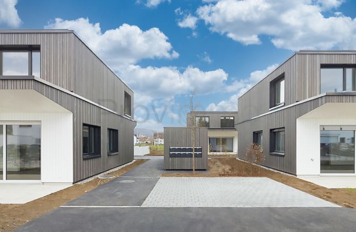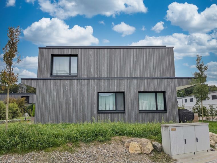 Der gezielte Fassadenkontrast unterstreicht die moderne Gestaltung: Während im Bereich der Eingänge und Sitzplätze eine helle, weiss geschlossene Holzschalung verwendet wurde, ist die übrige Fassade mit dunkelgrauen Holzlamellen ausgeführt. Dieses Zusammenspiel wirkt hochwertig, zeitlos und architektonisch stimmig.