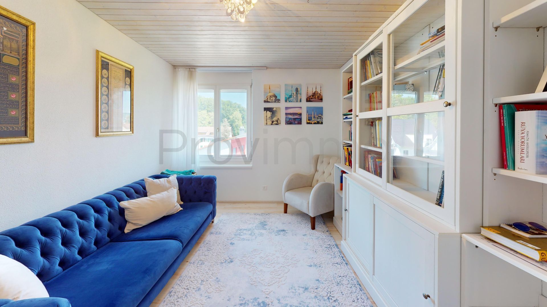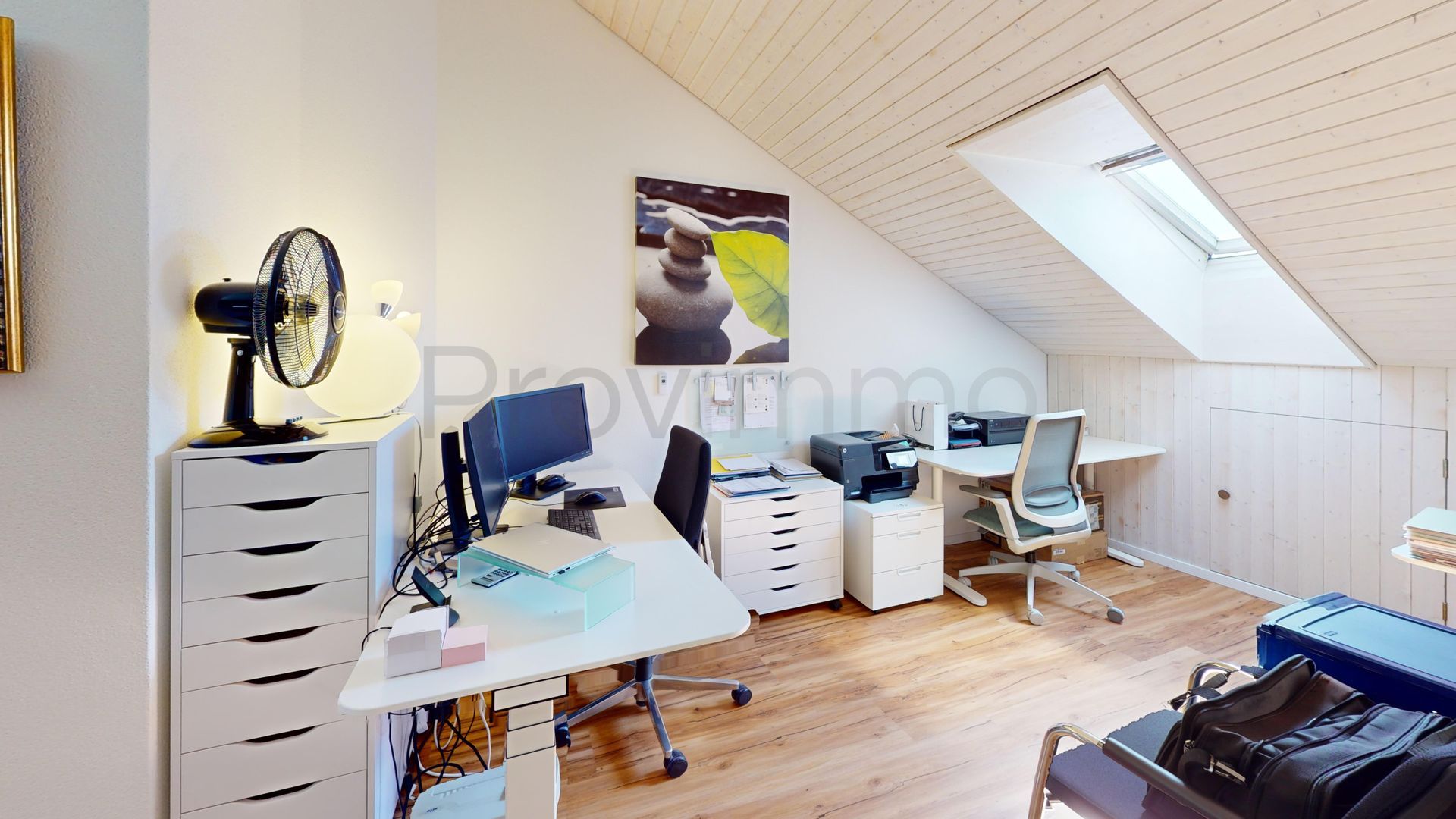 Ursprünglich als 5.5-Zimmer-Wohnung konzipiert, wurde der offene Galeriebereich inzwischen mit einem vollwertigen Büro ausgebaut. Damit entstand eine funktionale 6.5-Zimmer-Wohnung, die auch grösseren Familien viel Raum zur Entfaltung bietet. Mit einer ein-fachen Trockenbauwand lässt sich hier sogar noch ein weiteres Zimmer realisieren – ideale Voraussetzungen für ein separates Kinderzimmer, ein zweites Büro oder ein Gästezimmer. So entsteht bei Bedarf eine vollwertige 7.5-Zimmer Familienwohnung – ein in dieser Preisklasse und Region seltenes Raumangebot.