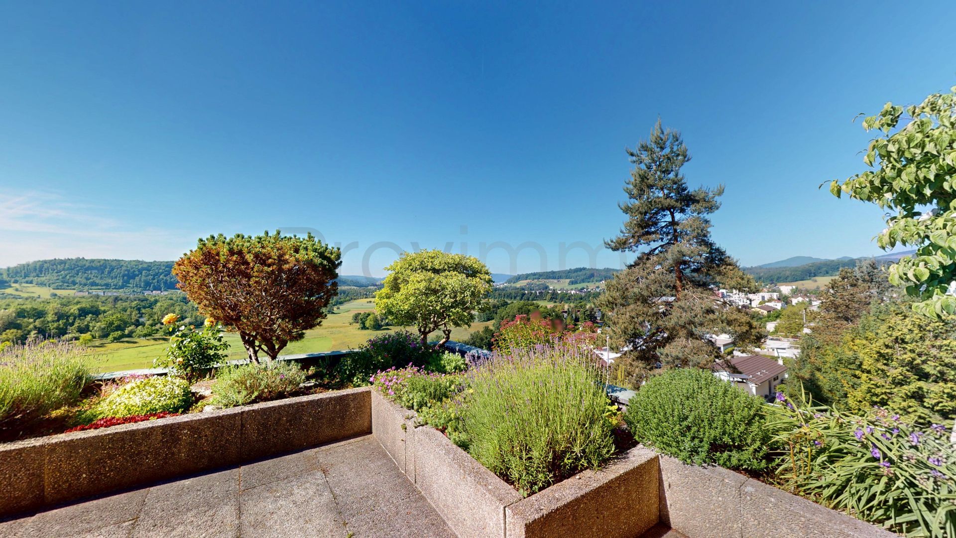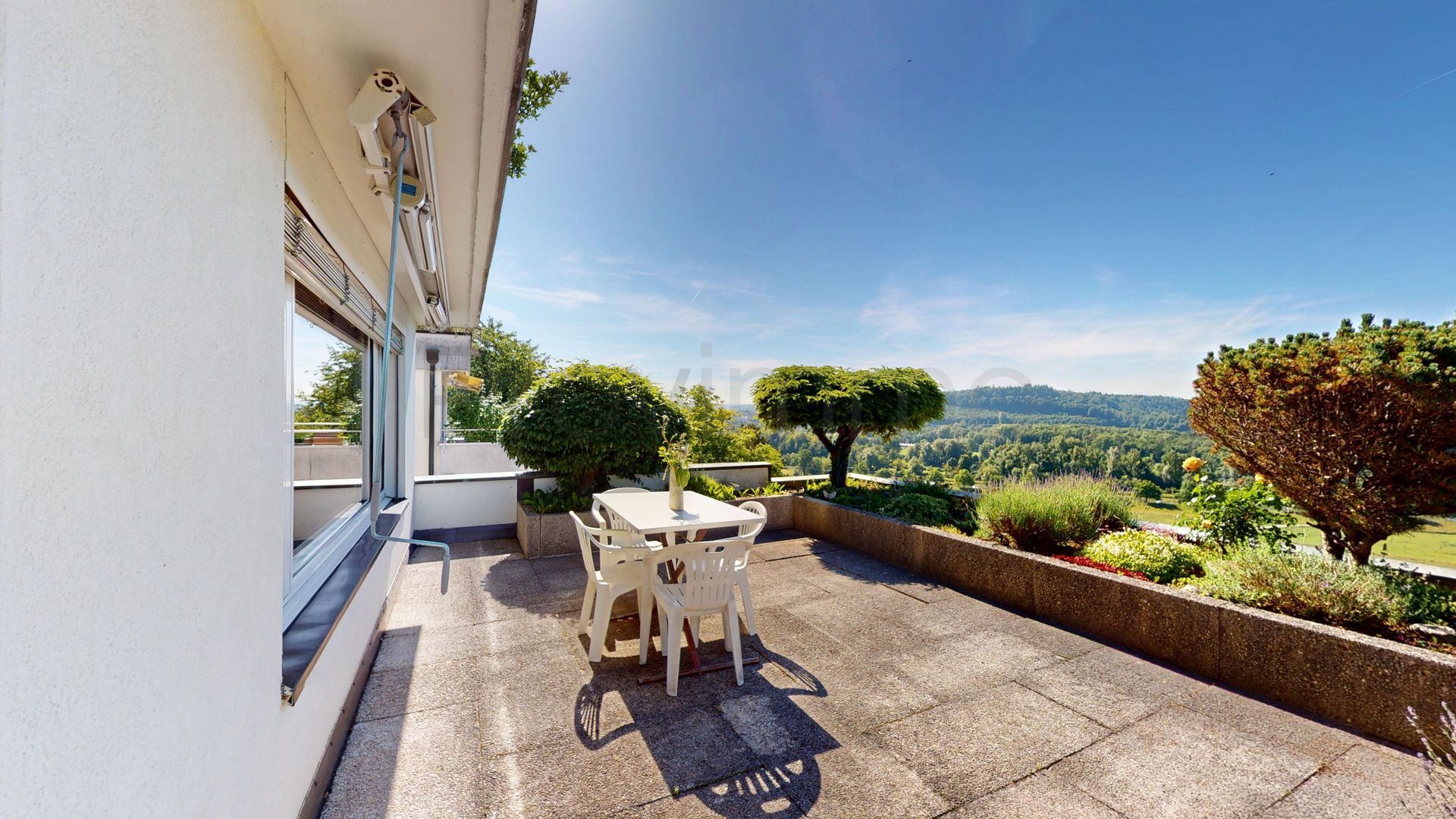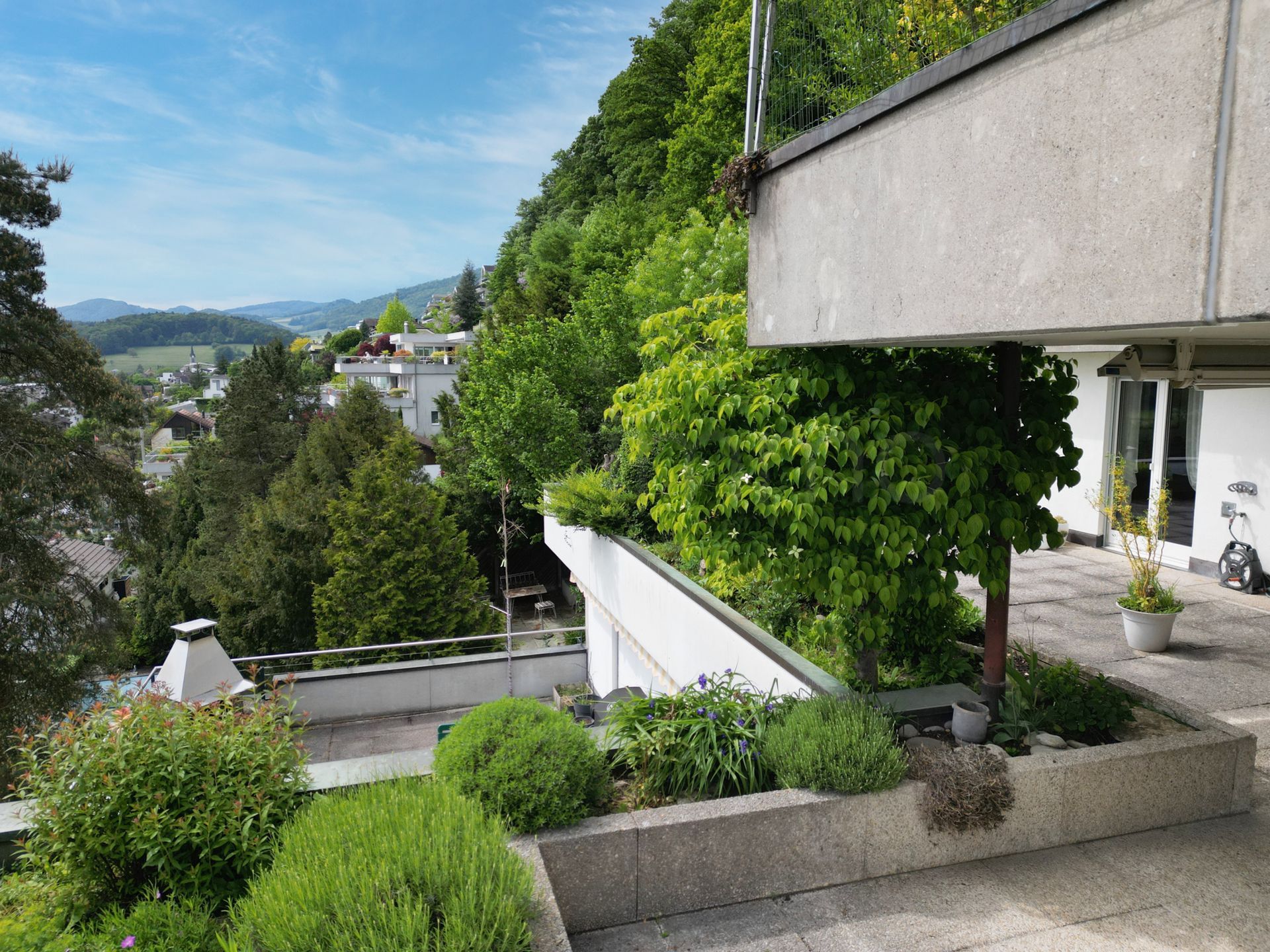 Der Aussenbereich ist ein Highlight für sich: Die Terrasse sowie der auf der Westseite gelegene und direkt durch den hinteren Teil der Wohnung zugängliche Pool laden zu entspannten Stunden im Freien ein. Sei es zum Sonnenbaden, Spielen mit Kindern oder geselligen Grillabenden mit Freunden. Die Lage garantiert ganztägig eine sehr gute Besonnung, während die Hanglage eine atemberaubende Weitsicht über die umliegende Landschaft ermöglicht und zugleich Privatsphäre schafft.