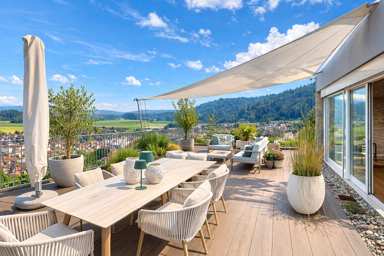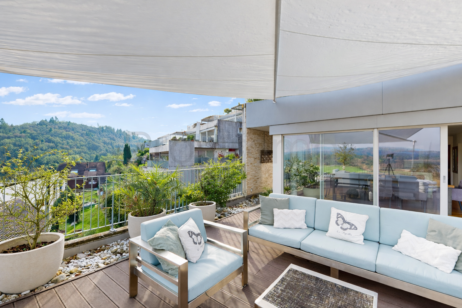 Insgesamt stehen rund 166 m² Aussenfläche zur Verfügung, verteilt auf drei Terrassen, die vielfältige Nutzungsmöglichkeiten bieten. Die grosszügige Hauptterrasse ist mit einem ausfahrbaren Aussensegel ausgestattet, welches in den warmen Sommermonaten für angenehmen Schatten sorgt und gleichzeitig ein stimmungsvolles Ambiente schafft.