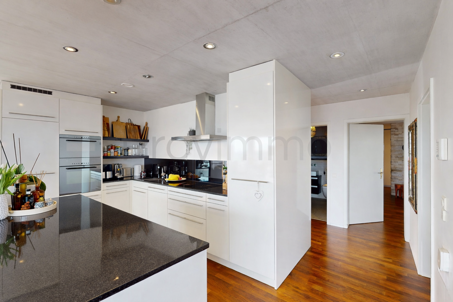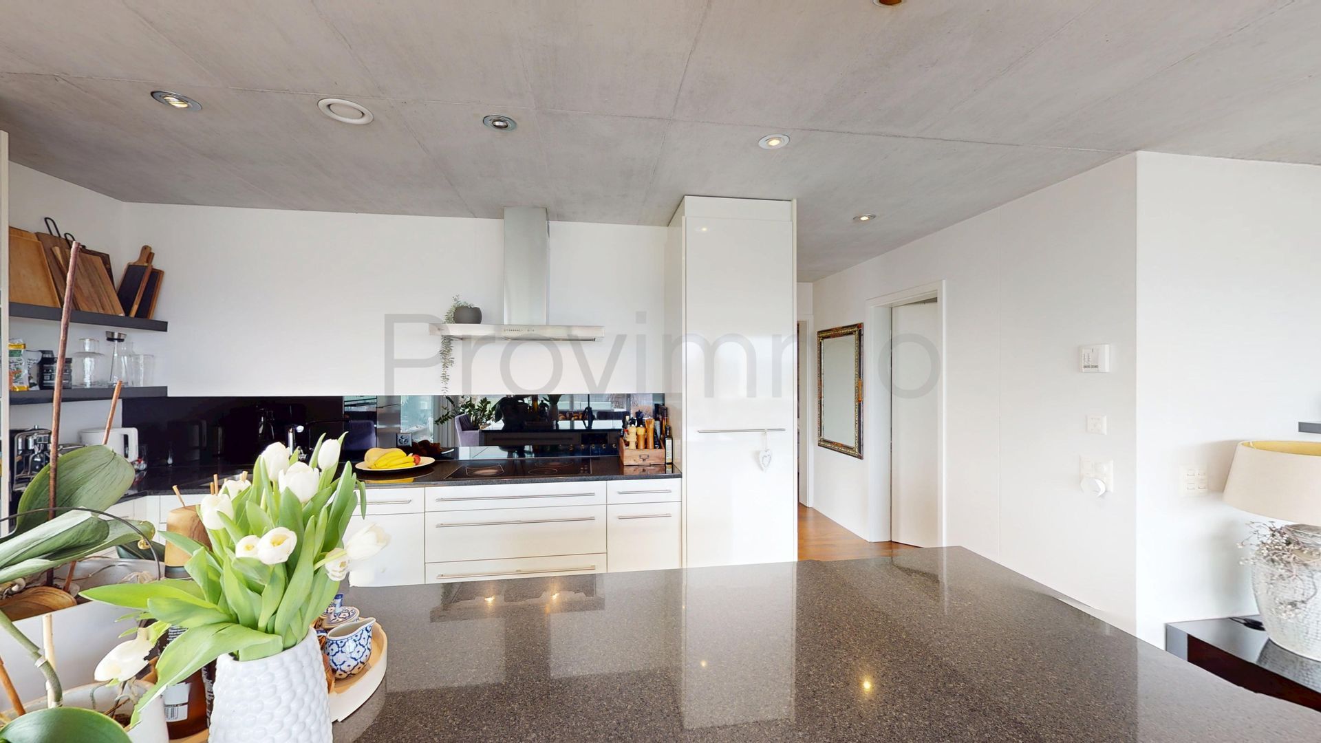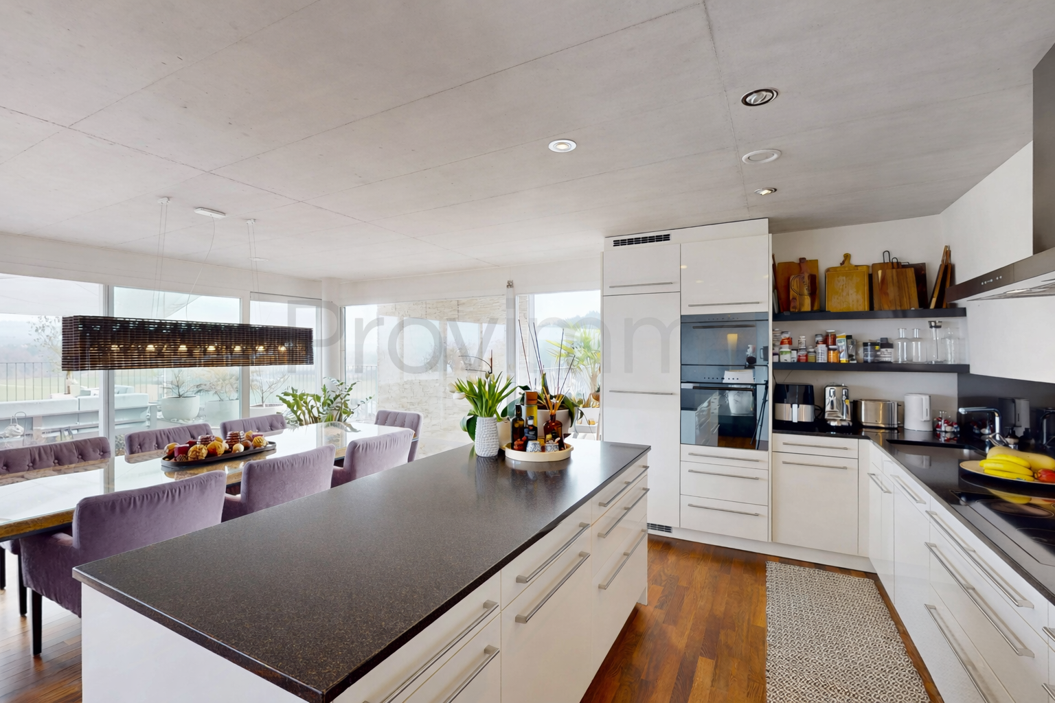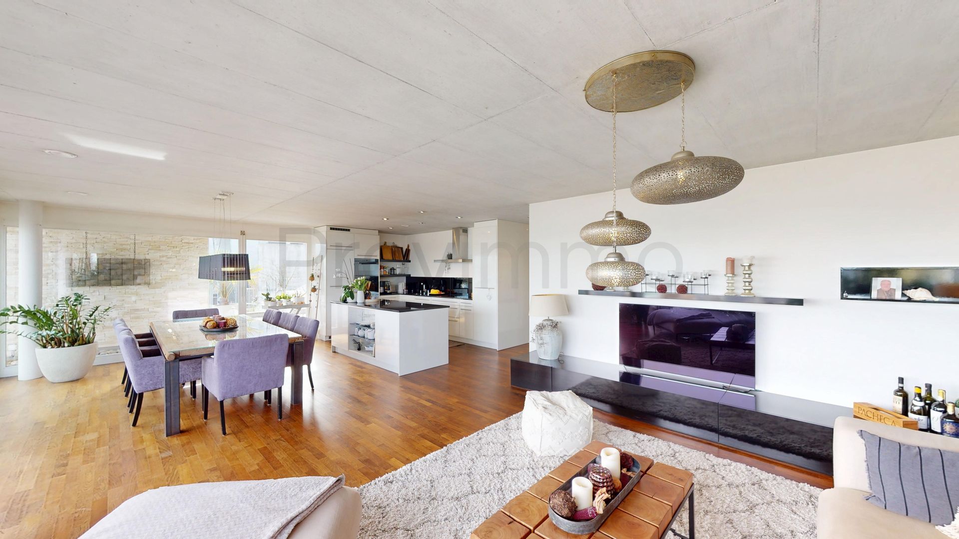 Mit rund 209 m² Nettowohnfläche bietet die Wohnung ein aussergewöhnlich grosszügiges Raumangebot. Der offen gestaltete Wohn-, Ess- und Küchenbereich bildet das Herzstück und wird durch grosse Fensterflächen mit Tageslicht durchflutet. Die Räume wirken hell, einladend und bieten dank der optimalen Ausrichtung eine ganztägige Besonnung. Der direkte Zugang zur weitläufigen Terrasse erweitert den Wohnraum nach draussen und schafft eine nahtlose Verbindung zwischen Innen- und Aussenbereich.